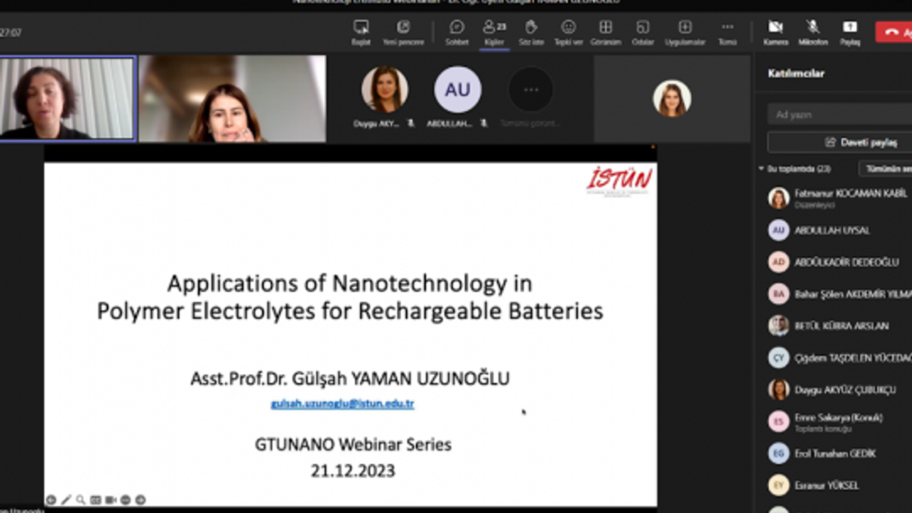 Etkinliğin son sunumunu gerçekleştiren İstanbul Sağlık ve Teknoloji Üniversitesi Kimya Mühendisliği Bölümü'nden Dr. Öğr. Üyesi Gülşah Yaman Uzunoğlu, özellikle batarya uygulamalarında kullanılan polimer elektrolitlerde 2-boyutlu nanomalzemelerin etkileri hakkında bilgiler sundu.