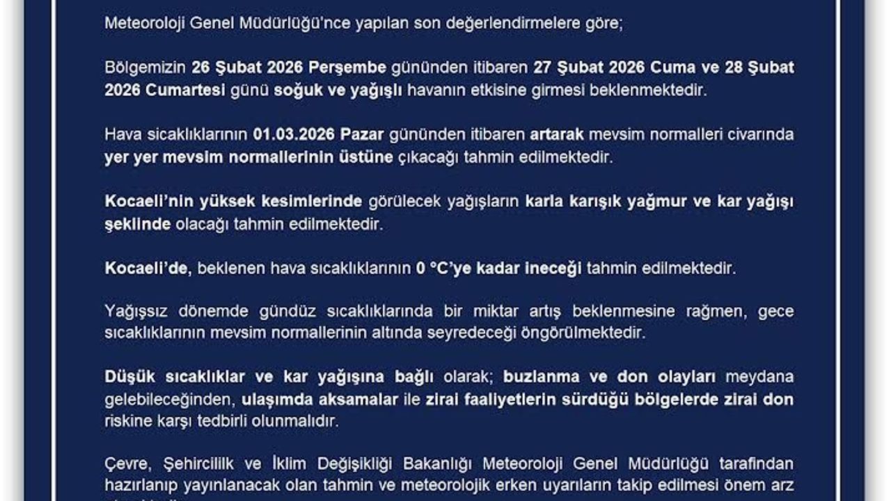 Meteoroloji Genel Müdürlüğü’nün açıklamasına göre, Kocaeli ve çevresi 26 Şubat Perşembe gününden itibaren soğuk ve yağışlı havanın etkisi altına girecek. 27 Şubat Cuma ve 28 Şubat Cumartesi günlerinde yağışların devam etmesi bekleniyor. Özellikle yüksek kesimlerde yağışların karla karışık yağmur ve kar şeklinde olacağı tahmin ediliyor.
