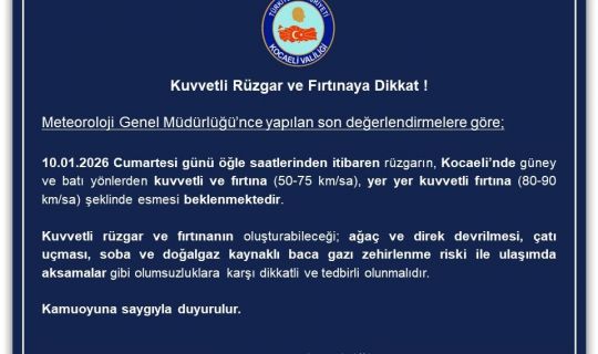 Meteoroloji’nin son değerlendirmelerine göre Kocaeli’de rüzgarın öğle saatlerinden itibaren güney ve batı yönlerden etkili olması bekleniyor. Rüzgarın saatte 50-75 kilometre hızla fırtına, yer yer ise 80-90 kilometre hızla kuvvetli fırtına şeklinde esmesi öngörülüyor.