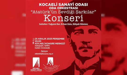 Kocaeli Sanayi Odası (KSO), Cumhuriyetimizin kurucusu Gazi Mustafa Kemal Atatürk’ün vefatının 87’nci yıl dönümü anısına özel bir etkinlik düzenliyor. KSO Oda Orkestrası tarafından gerçekleştirilecek “Atatürk’ün Sevdiği Şarkılar” konseri, 25 Aralık 2025 Perşembe günü müzikseverlerle buluşacak.