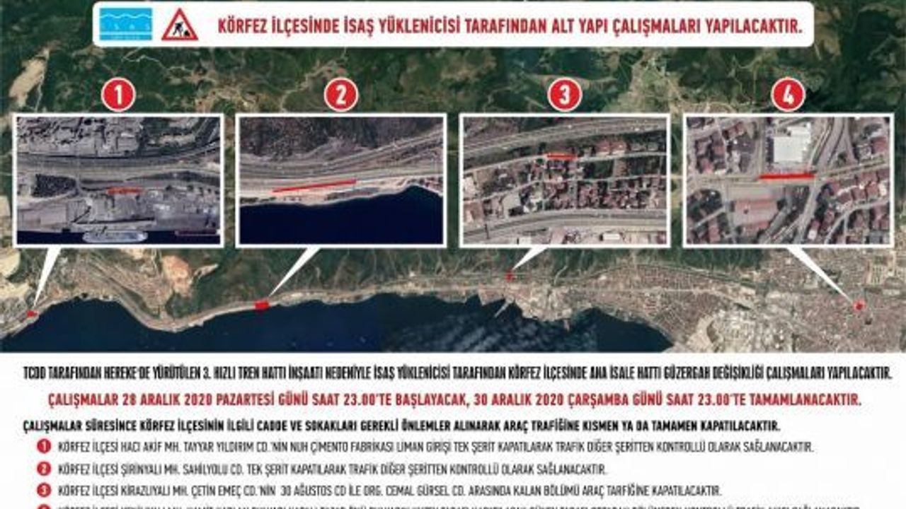 Bu kapsamda çalışma süresince Körfez ilçesi Hacı Akif Mahallesi Tayyar Yıldırım Caddesi'nin Nuh Çimento Fabrikası Liman girişinde trafik düzenlemesine gidilerek trafik diğer şeritten kontrollü olarak sağlanacak. Körfez ilçesi Şirinyalı Mahallesi Sahil Yolu Caddesi tek şerit kapatılarak trafik veya şeritten kapatılarak trafik diğer şeritten kontrollü olarak sağlanacak.