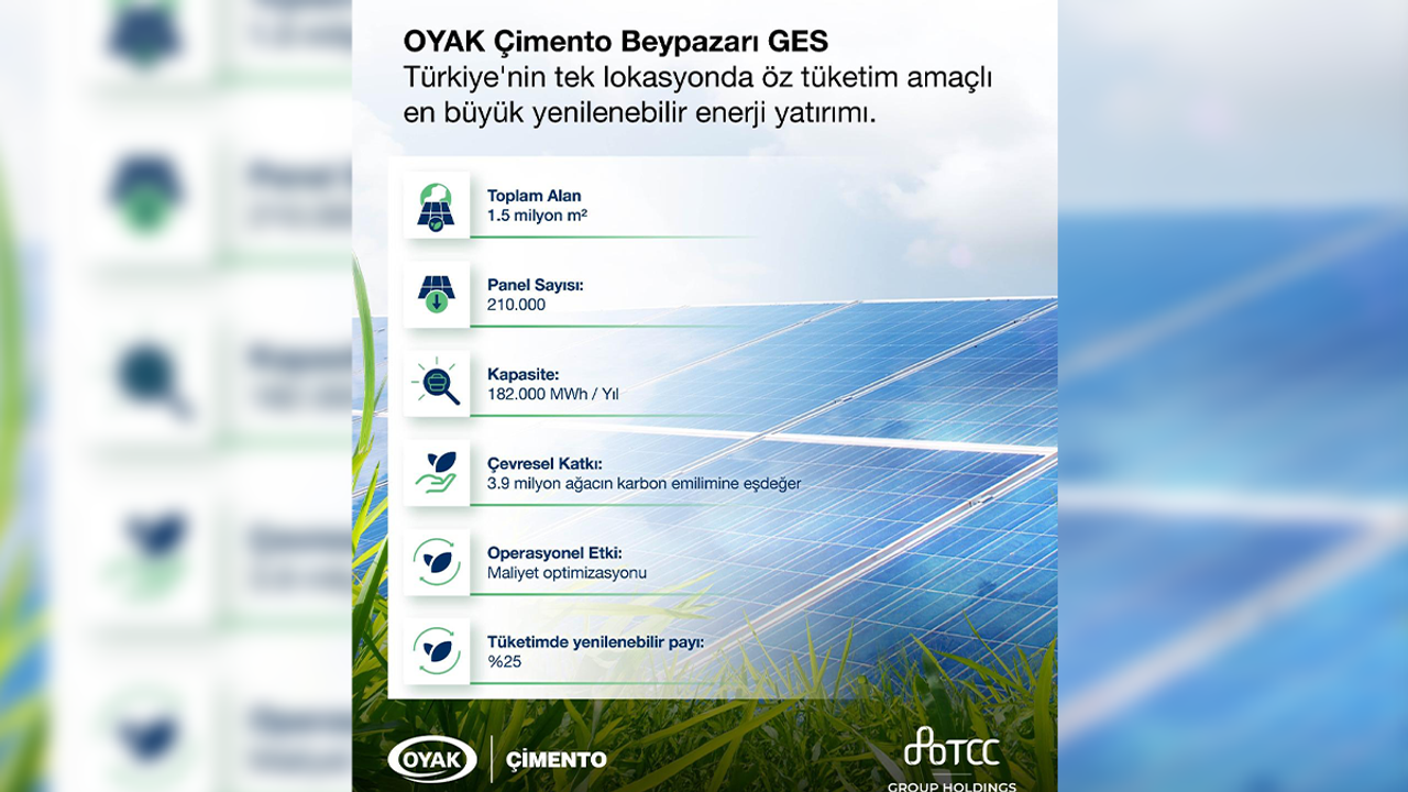 Yaklaşık 1.500.000 metrekarelik alana kurulan Beypazarı GES’te 210.834 adet güneş paneli, 2 milyon metre kablo ve 4.900 ton çelik kullanıldı. Yıllık 182.000 MWh temiz enerji üretmesi beklenen tesis, yaklaşık 3,9 milyon ağacın yıllık karbon emilimine eşdeğer çevresel fayda sağlayacak. Operasyonel maliyetlerde ciddi avantaj yaratacak proje, çimento sektöründe ölçeği ve niteliği itibarıyla bir ilk olarak değerlendiriliyor.