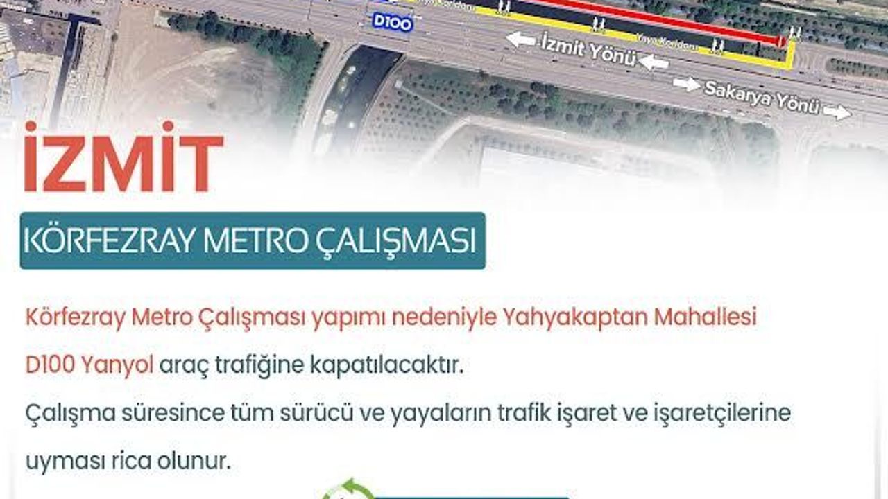 Kocaeli Büyükşehir Belediyesi ile Ulaştırma ve Altyapı Bakanlığı iş birliğinde yürütülen Körfezray Metro Projesi’nde çalışmalar hızla devam ediyor. Yahyakaptan Mahallesi’nde sürdürülen altyapı çalışmaları kapsamında Akasyalar Caddesi ve D-100 yan yol, 5 Mart Perşembe günü itibarıyla araç trafiğine kapatılacak.